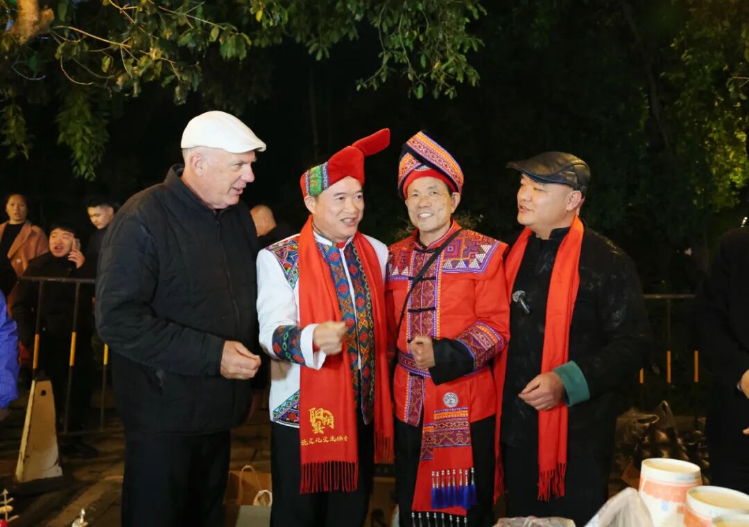夜幕降临,龙狮点睛仪式在龙头山码头举行。只见金宝初中师生龙狮队与中外游客组成的巡游队伍沿西街主线蜿蜒前行,灵动的龙狮穿梭于古街巷陌,与沿途花灯交相辉映,呈现“龙行山水间·灯映世界情”的流动盛景,传统民俗的魅力与国际交融的活力在此尽情绽放。墨西哥游客蒋腾飞说:“我觉得这些活动非常好。我非常喜欢舞龙舞狮。”加拿大华裔Ivan Ye激动地说:“这次活动好热闹,街上好多人。我从来没见过这么热闹的场面。”